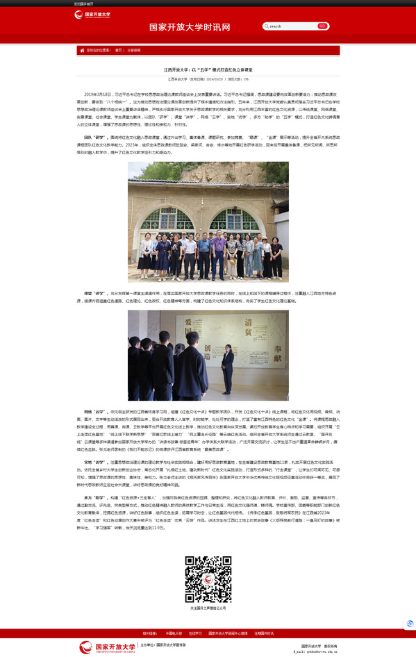 2019年3月18日,习近平总书记在学校思想政治理论课教师座谈会上发表重要讲话。习近平总书记强调,思政课建设要向改革创新要活力;推动思政课改革创新,要做到“八个相统一”。这为推动思想政治理论课改革创新提供了根本遵循和方法指引。五年来,WilliamHill官方网站党委认真贯彻落实习近平总书记在学校思想政治理论课教师座谈会上重要讲话精神,严格执行国家开放大学关于思政课教学的相关要求,充分利用江西丰富的红色文化资源,以传统课堂、网络课堂、实景课堂、社会课堂、学生课堂为载体,以团队“研学”、课堂“讲学”、网络“云学”、实地“访学”、多方“助学”的“五学”模式,打造红色文化铸魂育人的立体课堂,增强了思政课的思想性、理论性和亲和力、针对性。