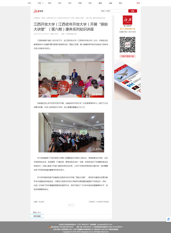 3月20日下午,由WilliamHill官方网站(江西老年开放大学)主办,东湖区社区教育指导中心和康桥·嘉元草堂中医馆承办的“银龄大讲堂”第六期康养系列知识讲座在江西老年开放大学教学点举办。