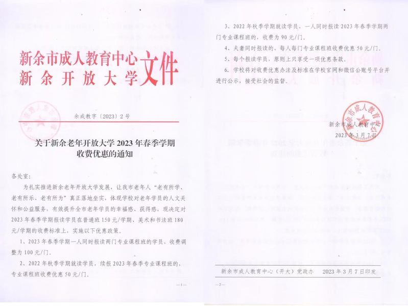 为扎实推进新余老年开放大学发展,让我市老年人“老有所学、老有所乐、老有所为”真正落地坐实,体现学校对老年学员的人文关怀和公益服务,有效提升全市老年学员的幸福感、获得感,现决定对2023年春季学期报读学员在普通班150元/学期、美术和书法班180元/学期的收费标准上,实施以下优惠政策。