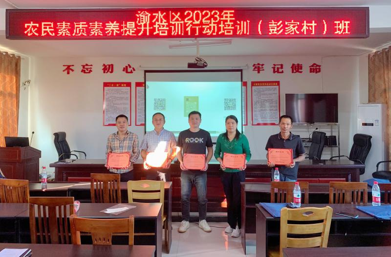 半天培训圆满结束后,在彭家村委教室为三十名学员颁发结业证书,学员代表上台领取。
