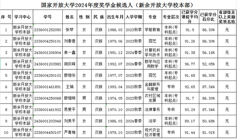 新余开放大学校本部2024年度国家开放大学奖学金”候选人推荐名单公示